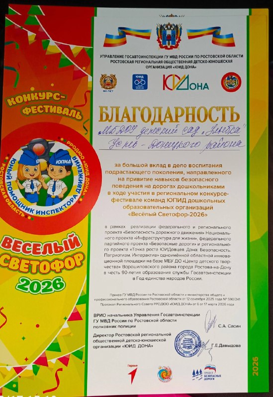 В Ростове-на-Дону прошел региональный конкурс-фестиваль команд Юных Помощников Инспекторов Движения (ЮПИД) дошкольных образовательных организаций "Весёлый Светофор-2026". Это событие призвано привить малышам культуру безопасного поведения на дорогах и собрало талантливые команды со всего региона. В этом году участники представили свои работы в формате видеороликов, что позволило им проявить фантазию и использовать современные технологии для создания увлекательных и поучительных сюжетов. На суд жюри было представлено 20 видеороликов: 7 от дошкольных учреждений Ростова-на-Дону и 13 от муниципальных районов Ростовской области. Среди участников был детский сад «Улыбка», победитель муниципального этапа конкурса в номинации "Регулировщицы". По итогам конкурса команда "Улыбки" заняла 2 место. Это достижение является результатом кропотливой работы детей, их воспитателей и родителей. Команда "Улыбки" продемонстрировала не только глубокие знания правил дорожного движения, но и артистизм, слаженность и искреннее желание сделать дороги безопаснее. Поздравляем победителей с этим замечательным результатом! | |